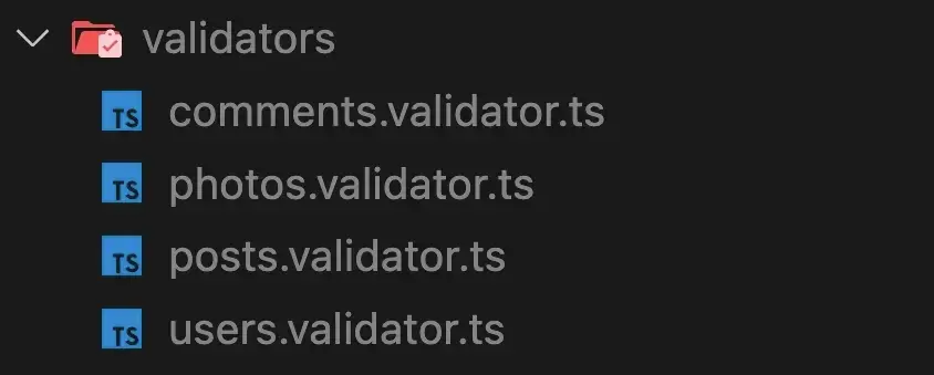 为了在我的项目中组织这些资源,我喜欢创建一个 @/validators 目录,然后为每种不同的资源类型创建一个文件。像这样: