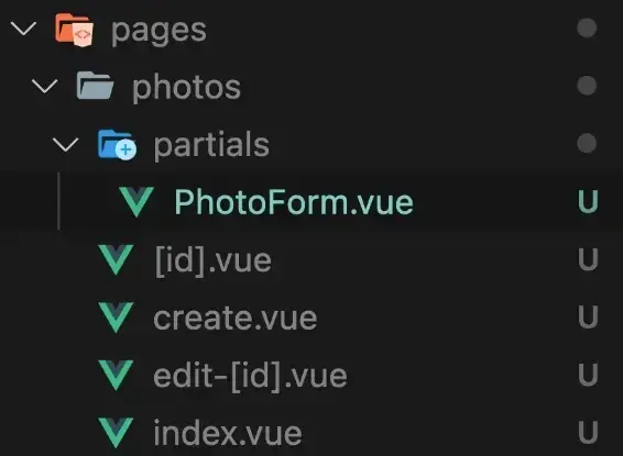 有时,你的组件可能只在单个页面或单个资源的几个页面中有用(例如上文中的 photos 资源)。在这种情况下,我发现将这些组件存储在 pages/[resource (ie. photos)] 目录下的某个目录中会很有帮助,而不是放在 components 目录中。我喜欢把这个目录称为 partials 。它在文件系统中的样子如下: